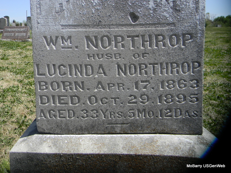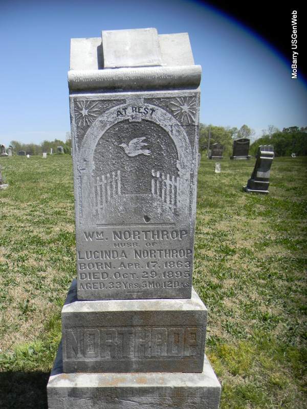 | NORTHROP, William | Apr. 17, 1863 | Oct. 29, 1895 | Inscription: "Husb. of Lucinda" "Aged 33 Yrs 5 MO 12 Das" - Research Note: Son of William B. Northrop and Amy Gray. His wife was Lucinda Elizabeth Hubbard. Mrs. Lucinda Northrop, age 32, second married Charles O. Clingenpeel, age 30, on Jan. 16, 1898 in Barry Co., MO. - Notes from ancestry.com, Hudson/Northrop Family Tree: William died of cholera. Daughter Mary also died at about the same time from cholera. When Lucinda's 1st husband (William) died she married Charles Clinginpeel. He had worked as a hired man on the farm prior to this marriage. The marriage was not a happy one. A couple of William's children left very soon after the marriage, and Lucinda and Charles separated not long after they were married. - Another Photo | MO Marriage Records Census Note Phyllis Long Photos Bill Utter |