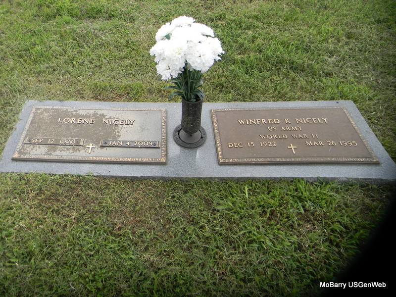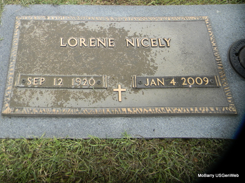 SSW: Lorene - Inscription: "US ARMY WW II" - Research Note: Son of Lon Nicely and Attie Lamberson. He moved to Joplin in 1946 from Neosho where he had worked for Carnation Co. He was employed by Sherwood Cleaners in Joplin. He later worked for Rocketdyne in Neosho for 10 years; was employed by Eagle-Picher Industries and was manager at Talbot Wire, Neosho. He retired from the lab at Missouri Steel Castings, where he worked from 1977 to 1986. He was a member of Earl J. Bruton Post #534, Veterans of Foreign Wars and the Joplin Bowling Association. He was a U.S. Army Corps veteran of World War II, serving in the Ninth Air Force. He married Lorene G. Myers on June 37, 1942, at Cassville. - Another Photo | Neosho Daily News Census Phyllis Long Photos Bill Utter |