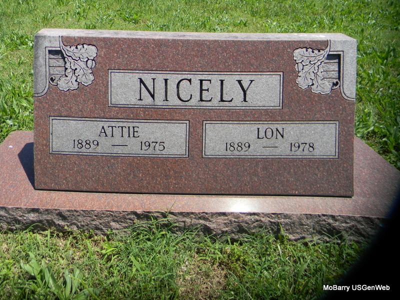 | NICELY, Attie (LAMBERSON) | 1889 | 1975 | SSW: Lon - Research Note: Daughter of Henry Phelps Lamberson and Laura V. Younce. Lonzo Nicely, age 22, married Attie Lamberson, age 22, on Jan. 28, 1912 in Barry Co., MO. | MO Marriage Records Census Phyllis Long Photo Bill Utter |