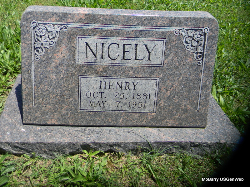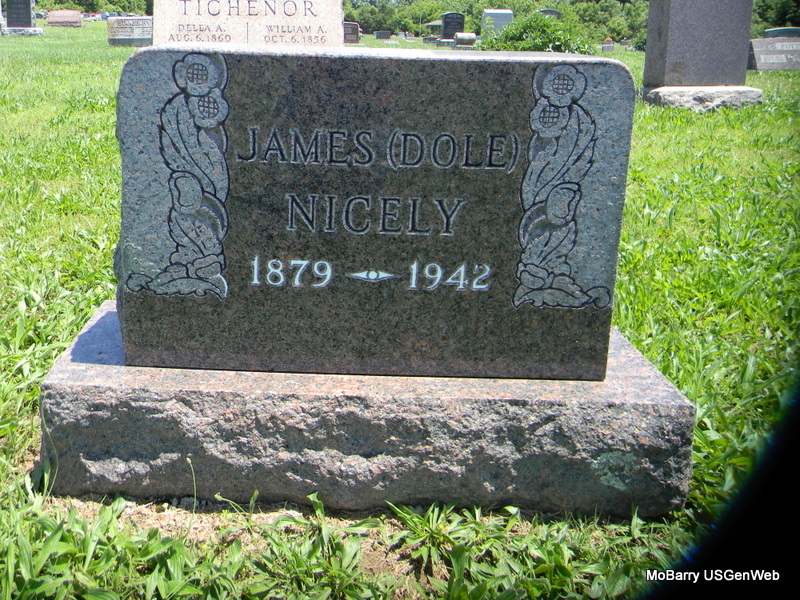 Research Note: His wife was Julia Nicely. Son of William Nicely and Hazeltine Buckner, both born TN. His wife was the informant on the death certificate. J. R. Nicely married Jennie Lind Utter on Dec. 2, 1906 in Stella, Newton Co., MO. Dole Nicely, age 53, second married Julia Williams, age 54, on Sept. 1, 1932 in McDonald Co., MO. | Death Certificate MO Marriage Records Phyllis Long Photo Bill Utter |