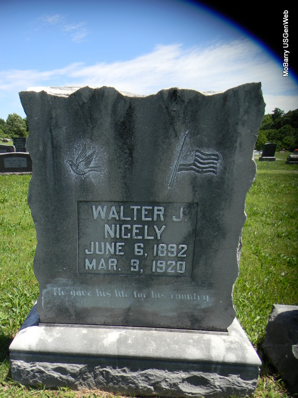 Inscription: "He gave his life for his country" - Research Note: Son of William Nicely and Hazeltine Buckner. He was single. Cause of death was meningitis following chronic abscess of the brain after a fracture of the skull in the War. The Dr. was W. M. Jones of the U. S. Marine Hospital, St. Louis, MO. Dole Nicely of Rocky Comfort, MO was the informant on the death certificate. - Wheaton Journal Friday March 12, 1920 - IN MEMORY OF JOHN WALTER NICELY - By request I will attempt to write a short sketch of the life and death of one of our most highly respected young men. It seems very sad indeed when we see our young men who have just entered into manhood and have begin a life of right and usefulness stricken down in death, but when God, who is the ruler of all things, sees fit in his great wisdom to call one of our friends and loved one away, no matter what stage of life we should be reconciled to it, for we know that God knows best and does all things right. John Walter Nicely was born June 6, 1892. Died March 9, 1920, age 27 years 9 months and 3 days. Volunteered his services to the Government in the Great World War and was put in Co. 3 (??) ( ??) 169 D. B. Feb. 16, 1918. Received an honorable discharge Dec. 24th of the same year. While he did not see any service over seas he was just as important a part of the service and faithfully and cheerfully discharged his duty. While in the Army he was in a train wreck and received a fractured skull which was somehow overlooked by the attending physician and was discharged with said injury unattended. Some time after he came home his head began to hurt him and he became so weak he could not do any work, yet not knowing the real cause. Everything that loving hands could do for him was done yet he became worse and was taken to a Joplin hospital. On Dec. 21, 1919 an operation was performed, taking out a piece of skull which was pressing the brain and it seemed for a while he would get well. But he became worse again and was taken to a St. Louis hospital where on March 3rd, 1920 a second operation was performed, discharging an abscess on the brain which resulted in his death. His body was shipped home for burial and was laid to rest in the Rocky Comfort Cemetery. Funeral services were conducted by Rev. Carlin. - DIES AT ST. LOUIS HOSPITAL - Walter, more familiarly known as Yank Nicely, son of Mr. and Mrs. W. M. Nicely of near Oshkosh died Tuesday night March 29, 1920 at a St Louis Hospital following a recent operation. About 18 months ago while in the Army, Walter received a fracture and other injuries in a train wreck and since being discharged has suffered from the effects of the skull fracture. A few months ago the fracture began affecting his mind and on Dec. 16th he was taken to the St. Johns hospital at Joplin where he was operated upon and not being satisfied with the result was sent to St. Louis where he was again operated on which resulted in his death. The body arrived at Wheaton Wednesday morning and was buried in the Rocky Comfort cemetery Friday afternoon. - Another Photo | Death Certificate Online Obit Census Phyllis Long Photos Bill Utter |
