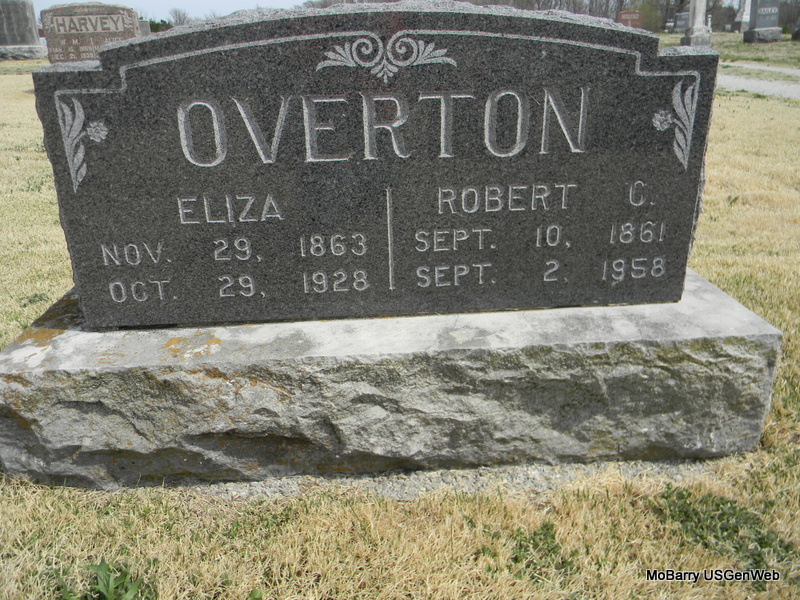 SSW: Robert C. - Research Note: Daughter of James Swindle born TN and Eliza Fly, born MO. Her husband was Robert C. Overton and he was the informant on the death certificate. - Wheaton Journal, November 1, 1928 - Eliza Swindle was born November 29, 1863 and died October 29, 1928 at the age of 64 years and 11 months. She was united in marriage to R. C. Overton December 24, 1882. To this union were born three children; Minnie Brattin of Wheaton, Wendell Ira, of Purdy, and Homer of Ft. Leavenworth, Kan. Her husband, her children and six grand children survive her. She leaves, also, four brothers and three sisters; John Swindle, of Deer, Ark., Lafayette, of Hollywood, Calif., George of Fairview, Abe of Santa Anna, Calif., Martha Parks, of Sumas, Washington, Nannie Overton of Purdy, Frances Holmes of Wheaton, and a step-sister, Sarah Garrison of Verona, Mo. She was an earnest student of the Bible, a true Christian, a devoted wife and mother, and the number of her friends is the number of her acquaintances. Funeral services were conducted by Rev. J. A. Meggison of Galena, Kan., Wednesday afternoon at the Baptist church and internment made in the Rocky Comfort Cemetery under the direction of Pogue Undertaking. - Cassville Democrat, Nov. 3, 1928 - MRS. BOB OVERTON DIES AT WHEATON - Wife of Prominent Wheaton Citizen Dies Suddenly Following Hear Attack. - Mrs. Ellen/Eliza Overton died at her home in Wheaton Monday morning following an attack of heart trouble. She took sick Sunday afternoon and died the following morning. Mrs. Overton was well known and highly respected citizen who had resided in that section of the county all her life. Mrs. Overton was about 65 years old and was daughter of Mr. and Mrs. James Swindle, old time and highly respected citizens of this county. She has lived in the Shoal Creek country, where she was born, all of her life. She was a member of the church and leaves one girl, Mrs. Walter Brattin of Wheaton, and two sons. Ira, who resides n the old home place on Shoal Creek and another son residing in California. All of her children were at her bedside at the time of her passing. Mrs. Overton was a wonderful character, possessing many true friends who had loved her since childhood. She was an excellent neighbor and did much for humanity. Funeral services were conducted at the Wheaton Baptist church Wednesday afternoon, after which the remains were laid to rest in the Rocky Comfort cemetery. A large number of sorrowing relatives and friends attended the services and interment. The Democrat sympathizes with the grief stricken family. | Death Certificate Online Obit Phyllis Long Photo Bill Utter |