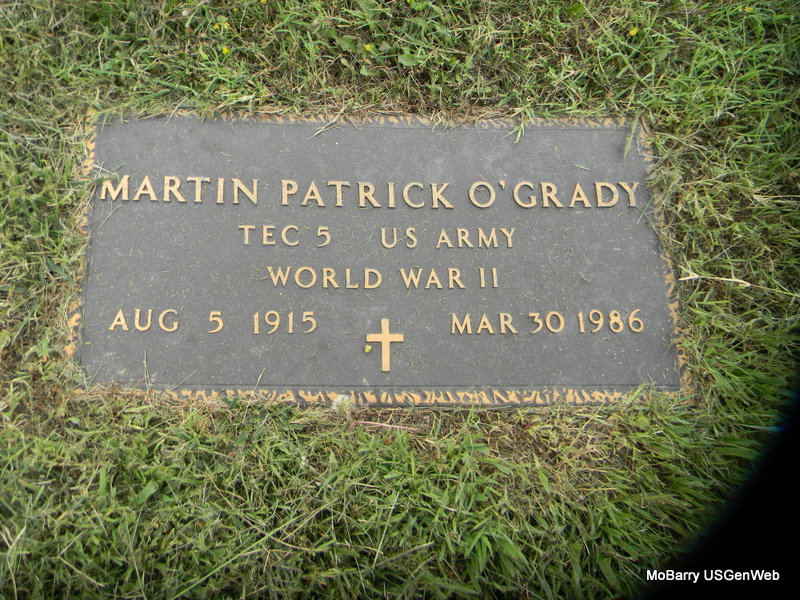 | O'GRADY, Martin Patrick | Aug. 5, 1915 | Mar. 30, 1986 | Inscription: "TEC 5 US ARMY WW II" - Research Note: His wife was Violet Roberts. | Note Phyllis Long Photo Bill Utter |