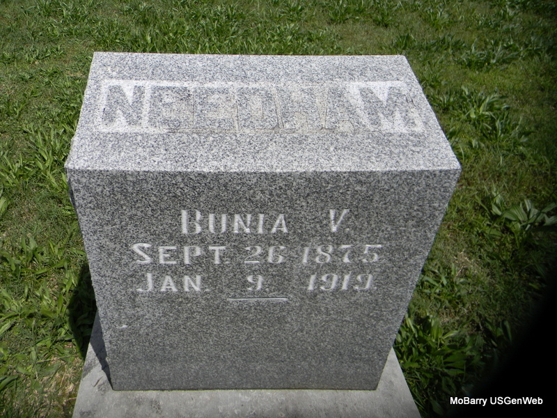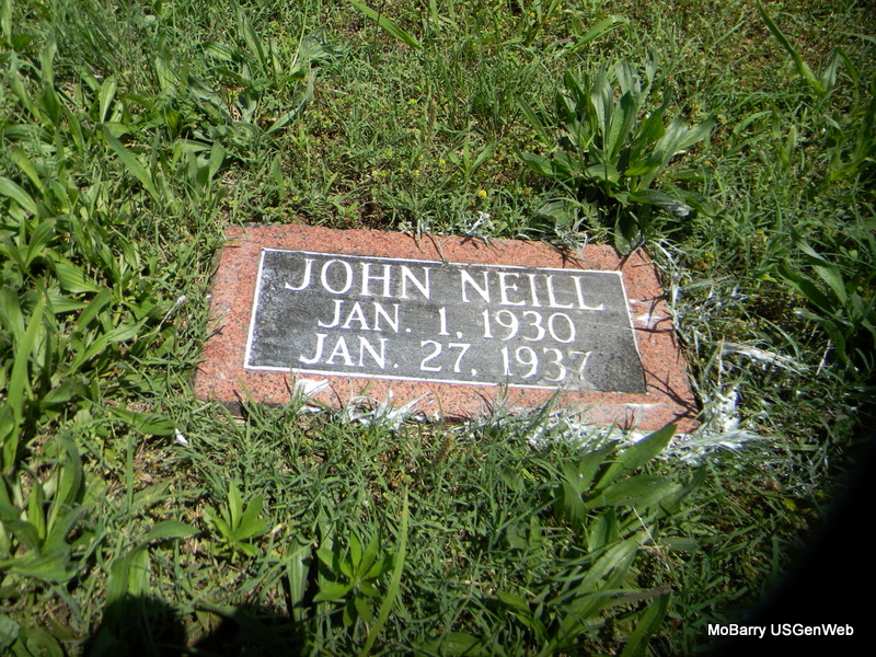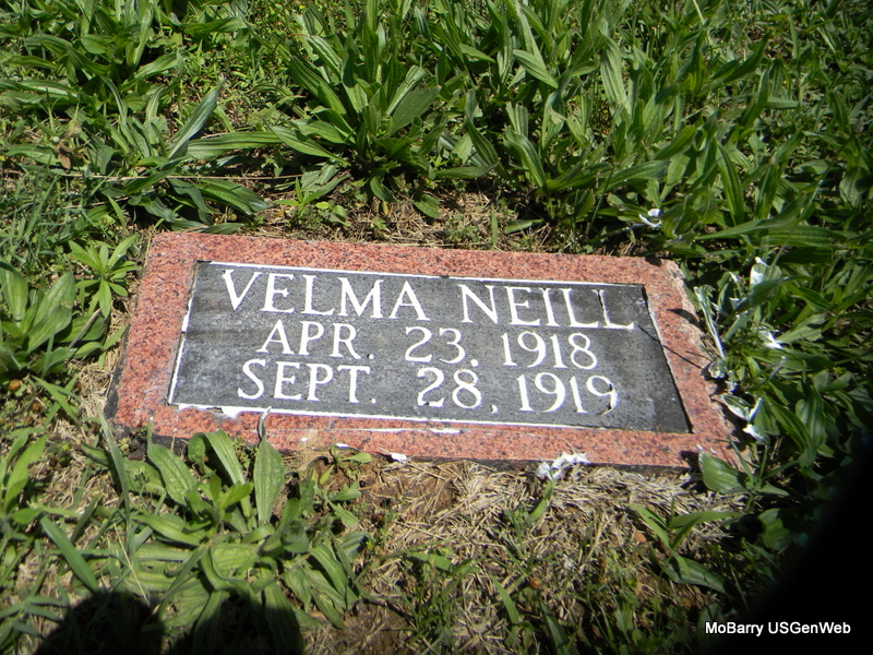 | NEILL, Velma Jane | Apr. 23, 1918 | Sept. 28, 1919 | Research Note: Buried next to John C. Neill, her brother. Daughter of Hugh Otis Neill and Flora Surber, both born Newton Co., MO. | Note Phyllis Long Photo Bill Utter |
