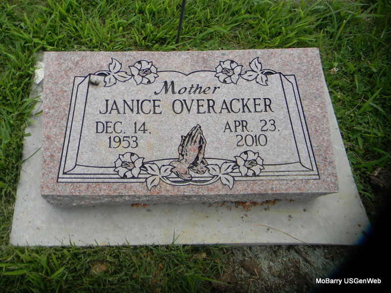 Inscription: "Mother" - Research Note: Janice Overacker, 56, of Siloam Springs died April 23, 2010, at Blount Memorial Hospital in Maryville, Tenn. Daughter of Evelyn E. Parmley and Irving Emerson Overacker. Two sons surviving in the obit with the surnames Norman and Garber. | Rogers Morning News Phyllis Long Photo Bill Utter |