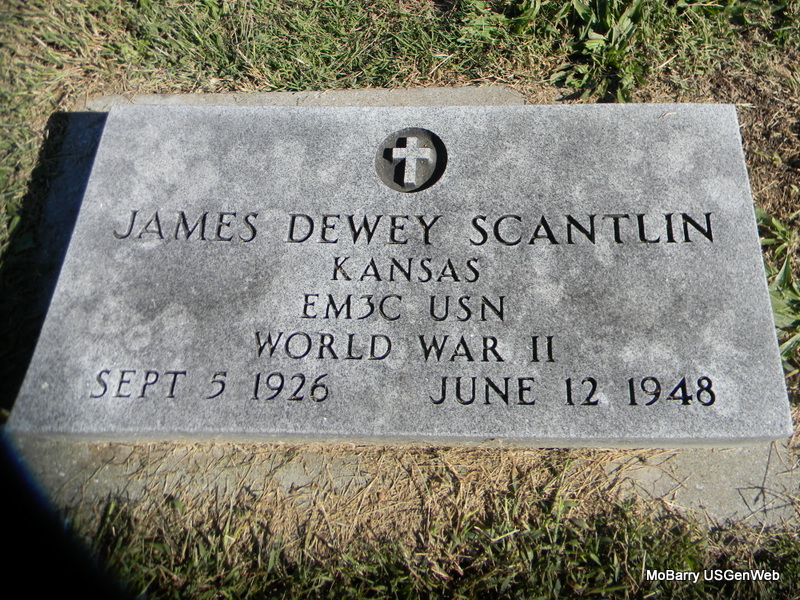 | SCANTLIN, James Dewey | Sept. 5, 1926 | June 12, 1948 | Inscription: "KANSAS EM3C USN WW II" - Research Note: Son of Dewey Cecil Scantlin and Aubrey Faye Schell. | Census Phyllis Long Photo Bill Utter |