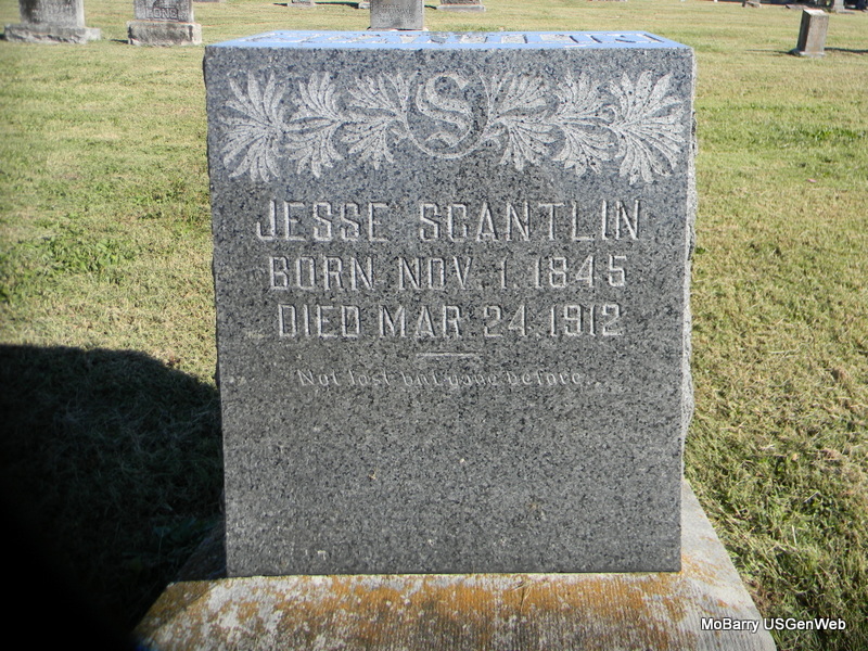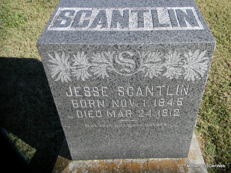 | SCANTLIN, Jesse | Nov. 1, 1845 | Mar. 24, 1912 | Research Note: His wife was Elizabeth Ann Hamilton. Son of John Benjamin Scantlin and Mahala Medley. Elizabeth Ann Hamilton married Jesse Scantlin on Oct. 21, 1866 in Gasconade Co., MO. She died on July 2, 1885 in Phelps Co., MO. Buried in Oak Forest Cemetery. Jesse second married Mary M. Pruitt on July 18, 186 in Maries Co., MO. Mary second married William W. Newman. - Another Photo | Census MO Marriage Records MO Death Index Phyllis Long Photos Bill Utter |
