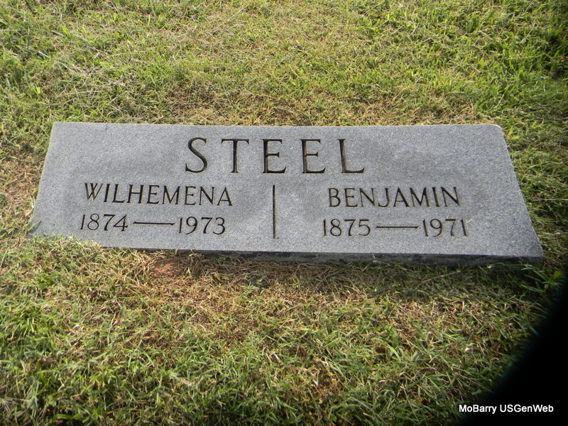 SSW: Wilhemena - Research Note: Son of Peter Steel and Anna Roltz. His wife was Wilhemena West and she was the informant on the death certificate. Rocky Comfort, MO residents. - 1940 census, Liberty, Barry, Missouri - Benjamin Steel, head, age 64, born PA, farmer; Wilhemena, wife, age 65, born PA. | Census Death Certificate Phyllis Long Photo Bill Utter |