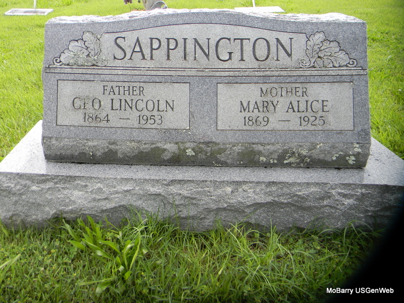 SSW: Mary Alice - Research Note: He was a merchant. Parents not known on the death certificate. George Sappington of Neosho, MO was the informant on the death certificate. - Son of Preston T. Sappington and Malinda Ann Wood. | Death Certificate Census Phyllis Long Photo Bill Utter |