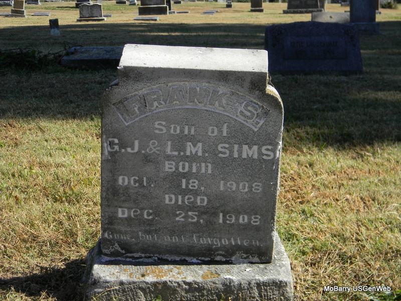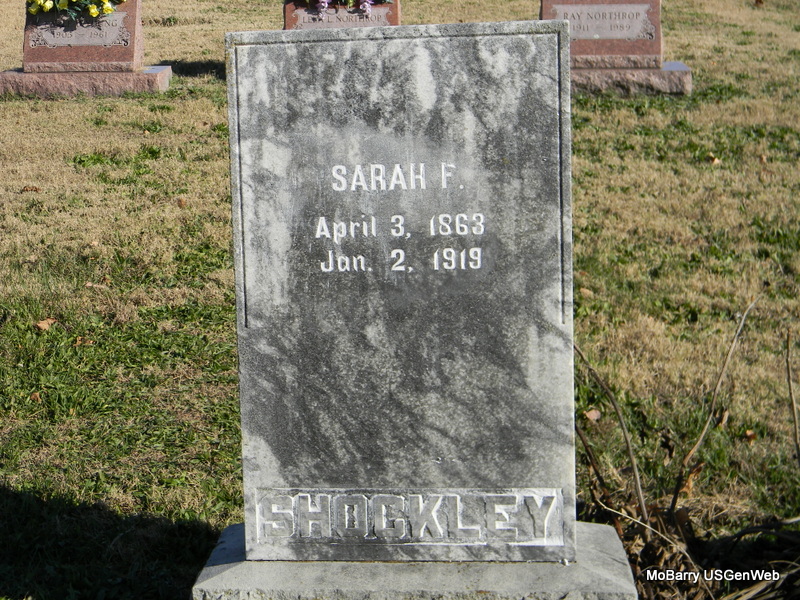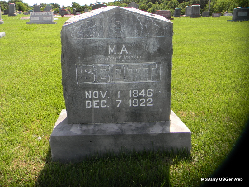 | SCOTT, Melinda Ann (LAUGHLIN) | Nov. 1, 1846 | Dec. 7, 1922 | Inscription: "Wife of Jesey Franklin" - Research Note: Daughter of John S. Laughlin and Julia Ann Spillers. Wife of Jesse Franklin Scott. Ann Laughlin married Jesse F. Scott on July 20, 1872 in Barry Co., MO. | Census MO Marriage Records Phyllis Long Photo Bill Utter |