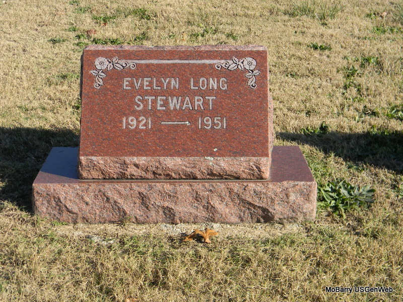 | STEWART, Evelyn Imogene (LONG) | Mar. 30, 1921 | Oct. 7, 1951 | Research Note: Daughter of James C. Long and Mellah J. Payne. Evelyn Gene Long, age 29, married Glen F. Stewart, age 33, on Oct. 25, 1950 in Granby, Newton Co., MO. | Census MO Marriage Records Phyllis Long Photo Bill Utter |