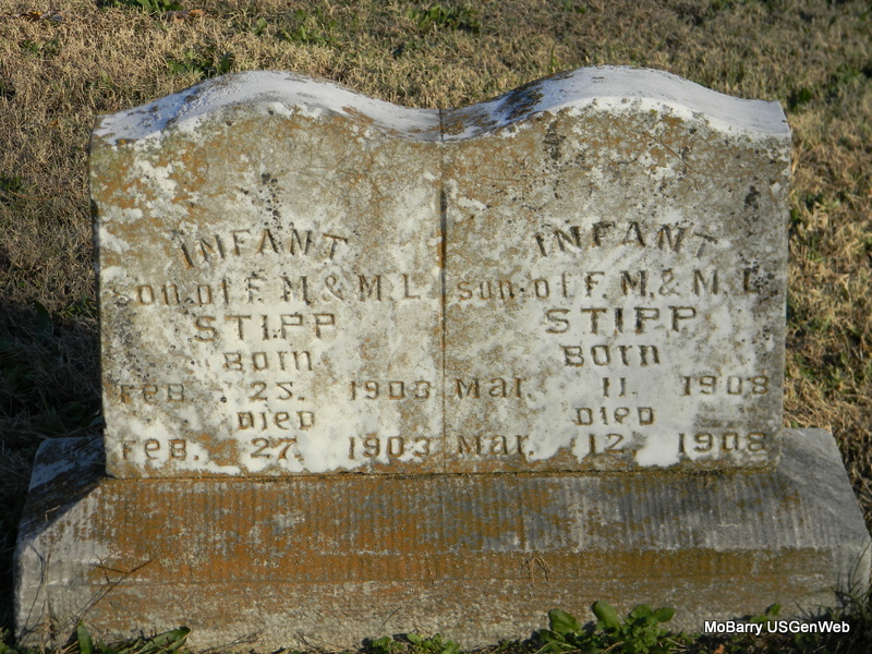 | STIPP, Infant | Mar. 11, 1908 | Mar. 12, 1908 | SSW: Infant - Inscription: "Son of F. M. and M. E." - Research Note: Son of Francis Marion Stipp and Martha "Mattie" Hearn. | Note Phyllis Long Photo Bill Utter |