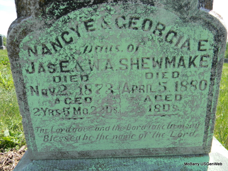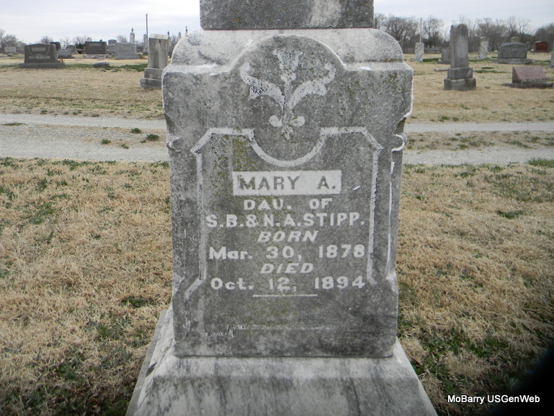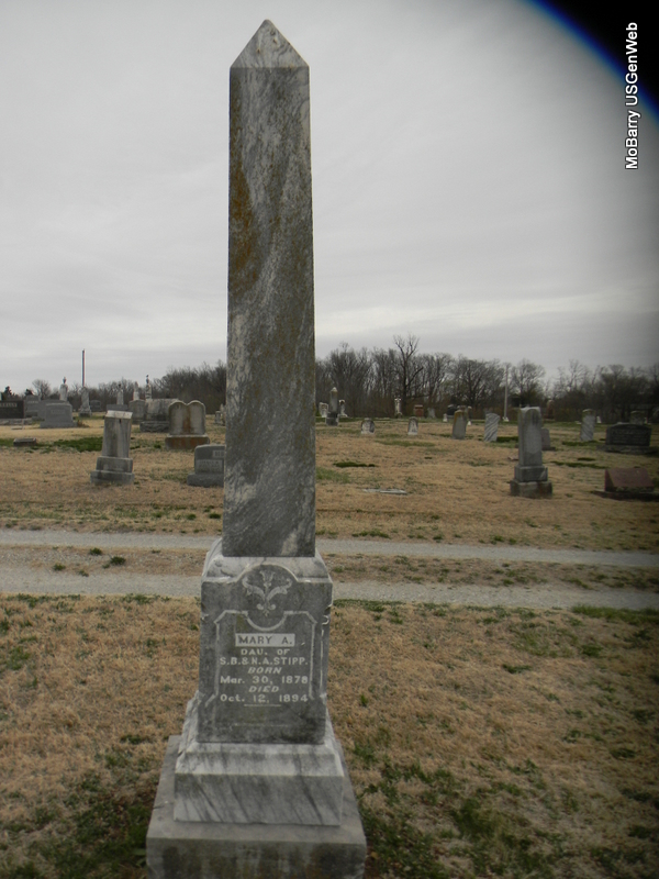 | STIPP, Mary A. | Mar. 30, 1878 | Oct. 12 1894 | Inscription: "Daughter of S. B. and N. A." - Research Note: Daughter of Simon Bolivar Stipp and Nancy A. McBrien. - Another Photo | Note Phyllis Long Photos Bill Utter |