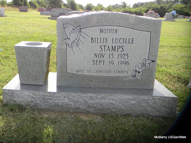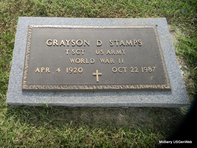 | STAMPS, Grayson D. | Apr. 4, 1920 | Oct. 22, 1987 | Inscription: "T SGT US ARMY WW II" - Research Note: His wife was Billie Lucille. Son of Charles R. Stamps and Maulsie Ora Harper. | Census Phyllis Long Photo Bill Utter |