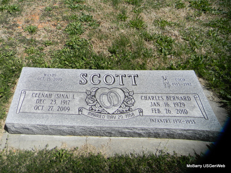 SSW: Ceenah "Sina" L. - Inscription: "Married May 29, 1959" "Infantry 1951-1953" - Research Note: Charles Scott, 81, shipping supervisor, died Friday. Graveside service 11 a.m. Tuesday, Rocky Comfort Cemetery, Rocky Comfort, MO. Funeral Services of Grand Lake. | Tulsa World Phyllis Long Photos Bill Utter |