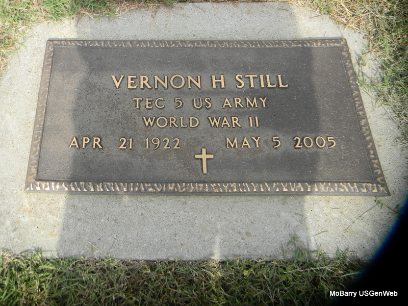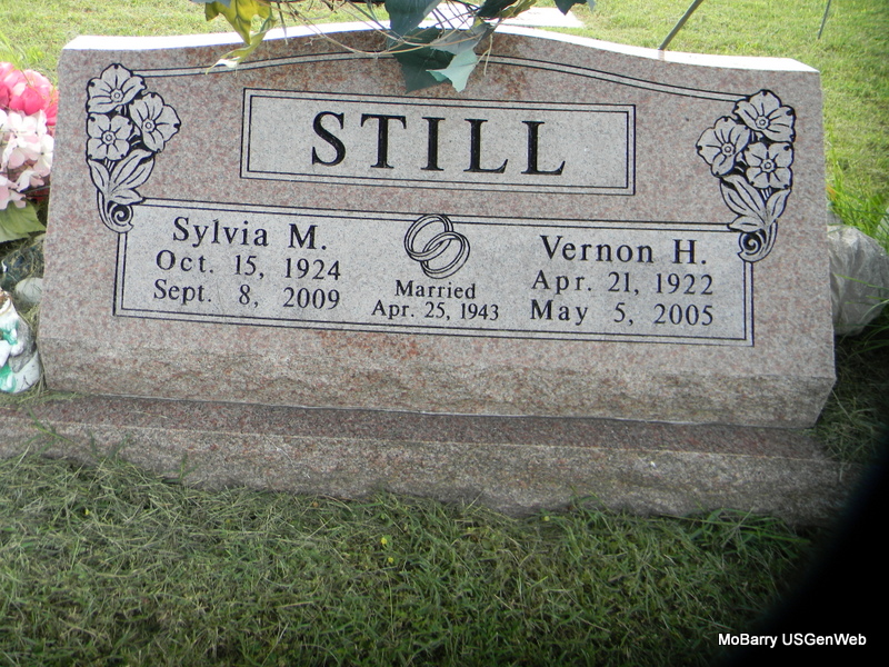 | STILL, Vernon H. | Apr. 21, 1922 | May 5, 2005 | SSW: Sylvia M. - Inscription: "Married Apr. 25, 1943" - Research Note: He was the son of James Washington "Jim" and Mable Clara (Cole) Still. He lived most of his life in Barry County and was an Army veteran. He was a former deputy sheriff in Carroll County and later was elected Barry County sheriff, serving from 1973-1980. He was president of the Barry County Sheriff Posse, was a cattleman and member of Ridgley Southern Baptist Church. He was a honorary member of the Wheaton Saddle Club. He was preceded in death by one daughter, Jeanie. Survivors include his wife, three children, nine grandchildren and 13 great-grandchildren; one sister and three brothers. - Back of Stone - Military Stone - Inscription: "TEC 5 US ARMY WW II" | Online Obit Phyllis Long Photos Bill Utter |