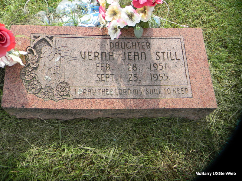 | STILL, Verna Jean | Feb. 28, 1951 | Sept. 25, 1955 | Inscription: "Daughter" - Research Note: Daughter of Vernon H. Still and Sylvia Marie Ridenour. | Note Phyllis Long Photo Bill Utter |
