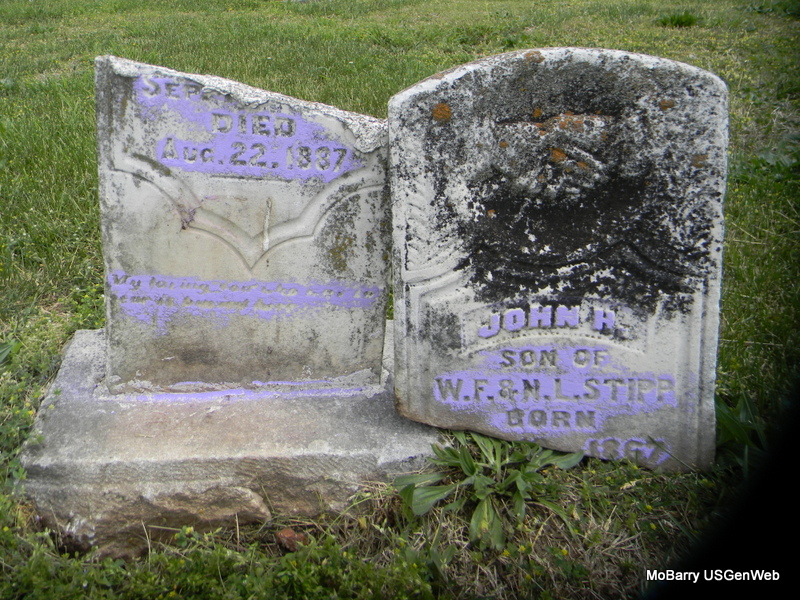 | STIPP, John R. | Sept. ??, 1867 | Aug. 22, 1887 | Inscription: "Son of W. F. and N. L." - Research Note: Stone broken. Son of William Franklin Stipp and Nancy Lavina DePriest. - Another Photo | Note Phyllis Long Photos Bill Utter |
