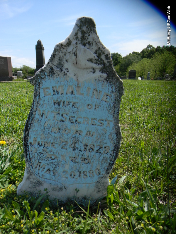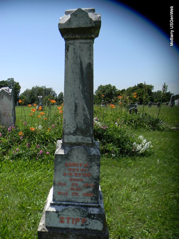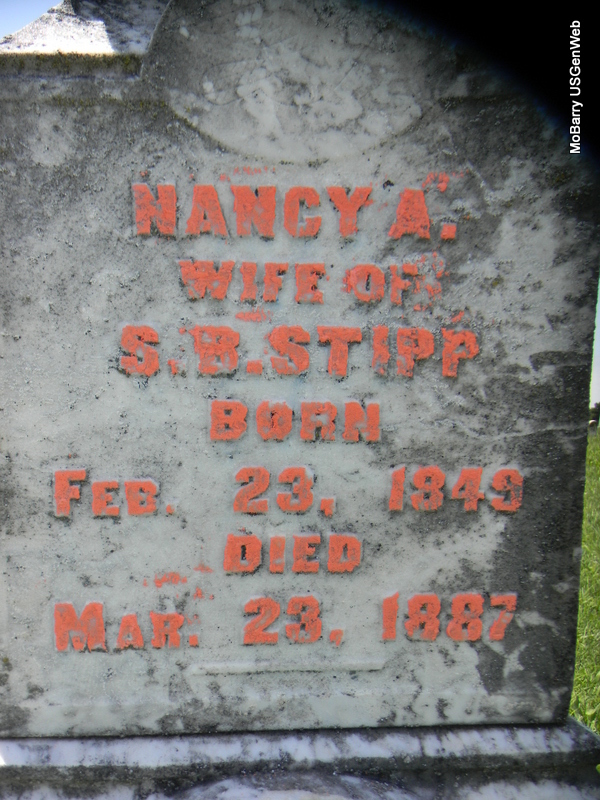 | STIPP, Nancy A. (McBRIEN) | Feb. 23, 1849 | Mar. 23, 1887 | Inscription: "Wife of Simon Bolivar Stipp" - Research Note: Daughter of James S. McBrien and Mary A. Barnes, both buried at Rocky Comfort Cemetery. - Another Photo | Census Phyllis Long Photo Bill Utter |
