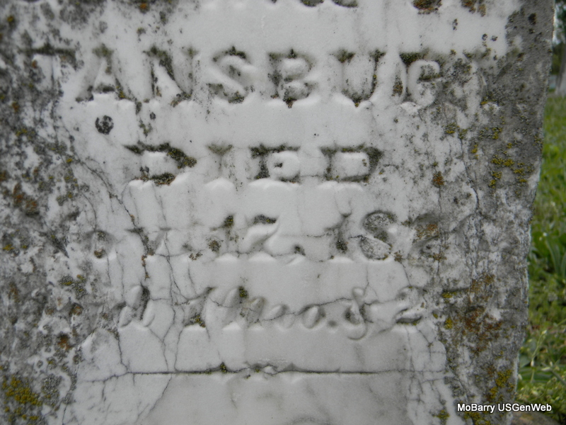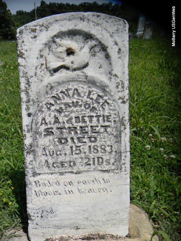 | STREET, Anna Lee | July 1883 | Aug. 15, 1883 | Inscription: "Aged 21 Ds." - Research Note: Daughter of A. and Bettie Street. Stone is old and worn. | Note Phyllis Long Photo Bill Utter |