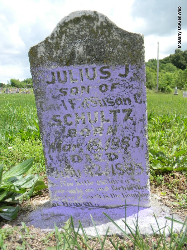 | SCHULTZ, Julius J. | Mar. 18, 1880 | July 12, 1885 | Inscription: "Son of Carl F. and Susan C." - Research Note: Not sure of dates. Son of Carl Frederick Schultz born Germany and Susan Catherine Short. | Note Phyllis Long Photo Bill Utter |