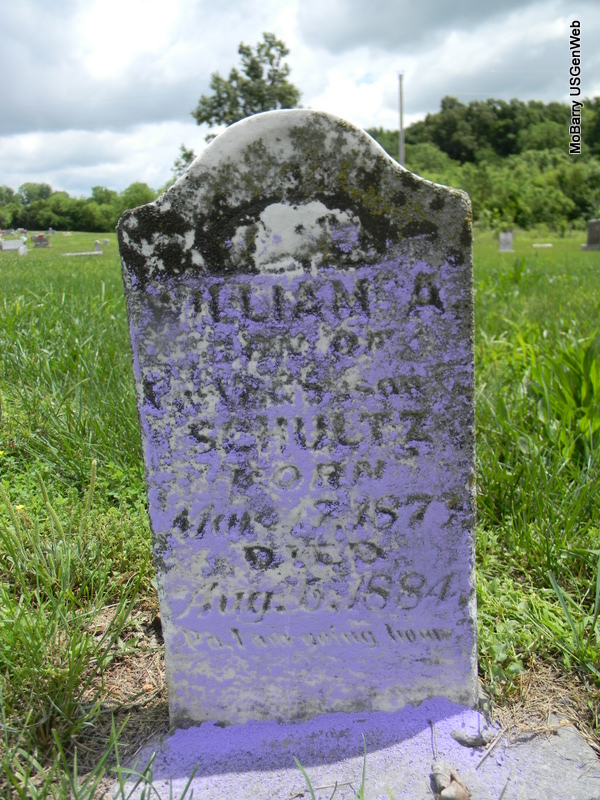 | SCHULTZ, William A. | June 7, 1873 | Aug. 6, 1884 | Inscription: "Son of Carl F. and Susan C." - Research Note: Not sure of dates. Son of Carl Frederick Schultz born Germany and Susan Catherine Short. | Note Phyllis Long Photo Bill Utter |