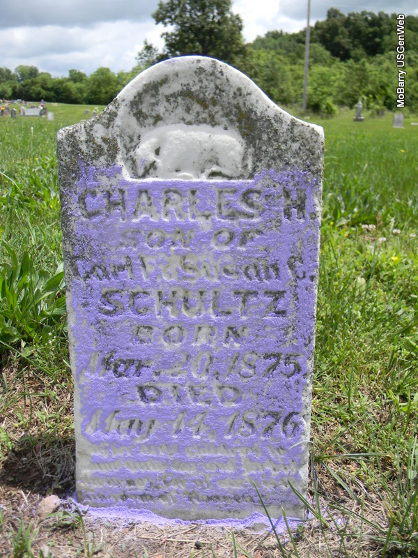 | SCHULTZ, Charles H. | Mar. 20, 1875 | May 19, 1876 | Inscription: "Son of Carl F. and Susan C." - Research Note: Son of Carl Frederick Schultz born Germany and Susan Catherine Short. | Note Phyllis Long Photo Bill Utter |