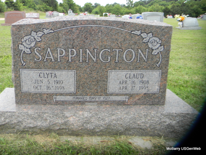 | SAPPINGTON, Claud Raymond | Apr. 16, 1908 | Apr. 17, 1998 | SSW: Clyta - Inscription: "Married May 17, 1927" - Research Note: Son of George Lincoln Sappington and Mary Alice Kincannon. | Census Phyllis Long Photo Bill Utter |