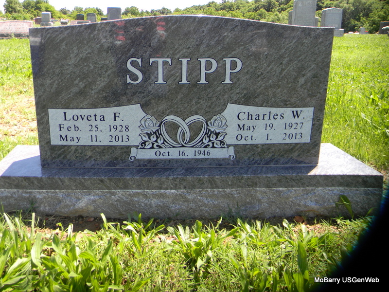 SSW: Loveta F. - Inscription: "Married Oct. 16, 1946" - Research Note: Charles Wilbur Stipp, 86, of Wheaton, passed away Tuesday, Oct. 1, 2013. He was the son of Oscar Wade Stipp and Addie Mae Hill. He was born May 19, 1927, at Sarcoxie and spent all of his adult life on his farm at Wheaton. He was a Charter member of Wheaton Southern Baptist Church. He married Loveta Cooper Oct. 16, 1946. She preceded him in death May 11, 2013. Preceding him in death were his beloved wife, Loveta; his mother and father, Wade and Addie Stipp; father-in-law and mother-in-law, Everett and Mattie Cooper; three sisters-in-law and two brothers-in-law. | Cassville Democrat Census Phyllis Long Photo Bill Utter |