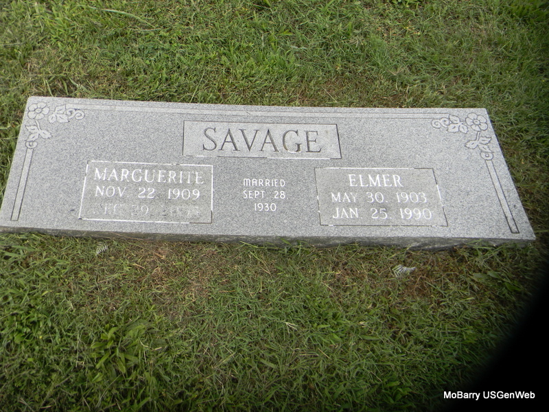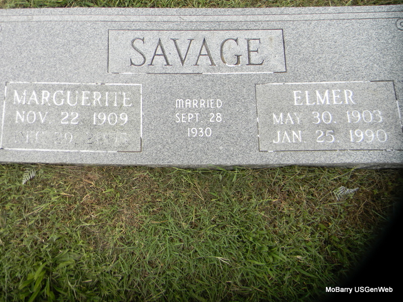 | SAVAGE, Elmer | May 30, 1903 | Jan. 25, 1990 | SSW: Marguerite - Inscription: "Married Sept. 28, 1930" - Research Note: Son of John David Savage and Delila Jane Terry. - Another Photo | Census Phyllis Long Photos Bill Utter |