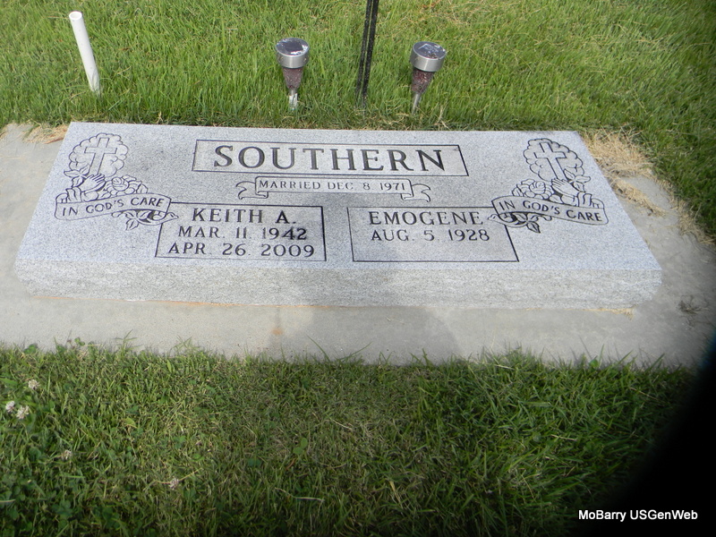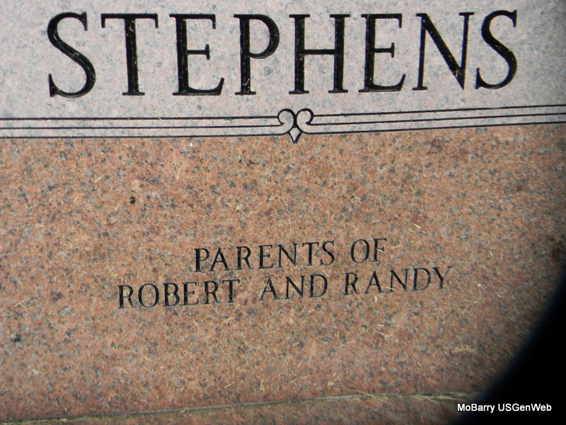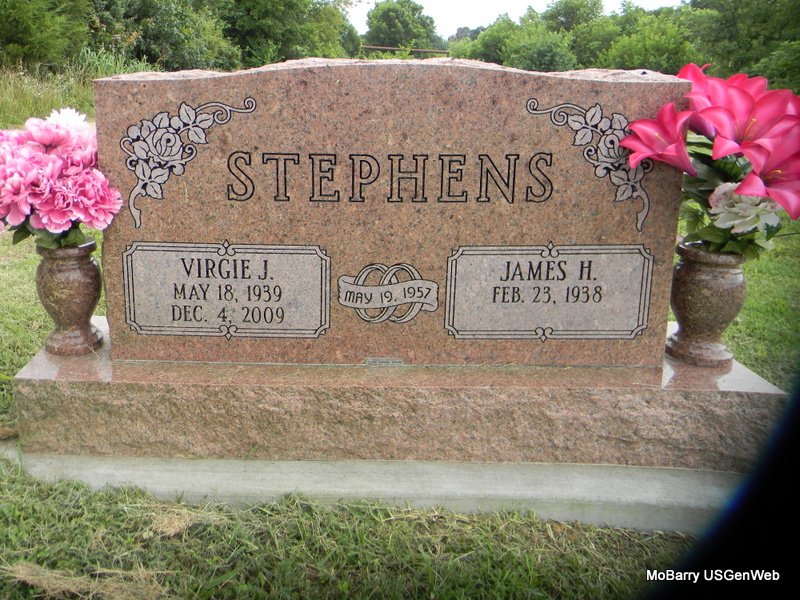 | STEPHENS, James Harold | Feb. 23, 1938 | No Date | SSW: Virgie J. - Inscription: "Married May 19, 1957" - Research Note: James H. Stephens, age 19, married Virgie Jean Dickens, age 17, on May 19, 1957 in Rocky Comfort, McDonald Co., MO. Vina Sligar, mother of James H. Stephens, gave consent. Geneva Dickens, mother of Virgie Dickens gave consent. - Maybe the son of Frank Emry Stephens and Jewell L. Moore. - Back of Stone | MO Marriage Records Census Phyllis Long Photos Bill Utter |