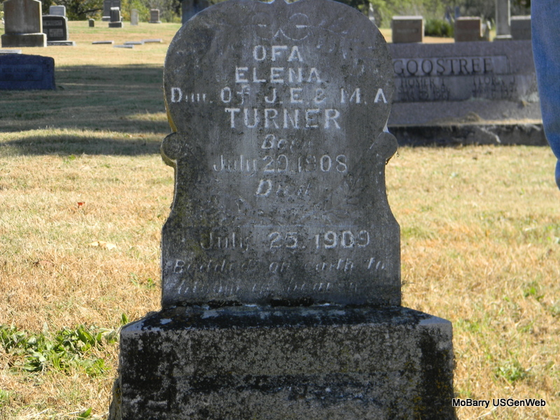 | TURNER, Ofa Elena | Jan. 29, 1908 | July 25, 1909 | Inscription: "Dau. of J. E. and M. A." | Photo Bill Utter |