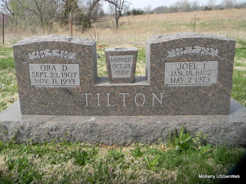 | TILTON, Joel Imray | Jan. 18, 1902 | May 2, 1973 | SSW: Ora D. - Inscription: "Married Oct. 25, 1924" - Research Note: Son of George R. Tilton and Mary Fowler. | Census Phyllis Long Photo Bill Utter |