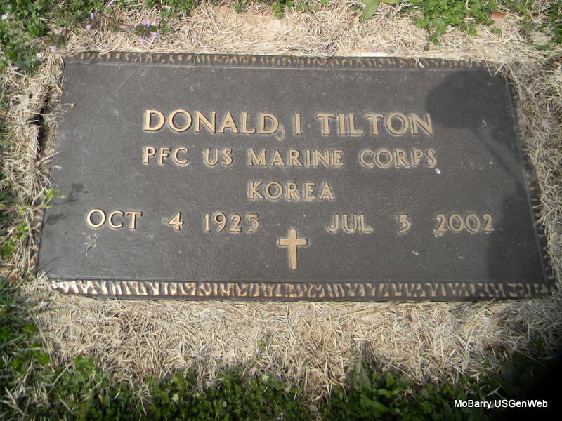 | TILTON, Donald Imlay | Oct. 4, 1925 | July 5, 2002 | Inscription: "PFC US MARINE CORPS KOREA" - Research Note: Son of Joel Imlay Tilton and Ora Dessie Clanton. He first married Margery Marie Barnett. Donald I. Tilton, age 36, second married Frances Pauline Cloud, age 35, on Jan. 18, 1962 in Kansas City, Jackson Co., MO. She was born Dec. 18, 1927. | Census MO Marriage Records Phyllis Long Photo Bill Utter |