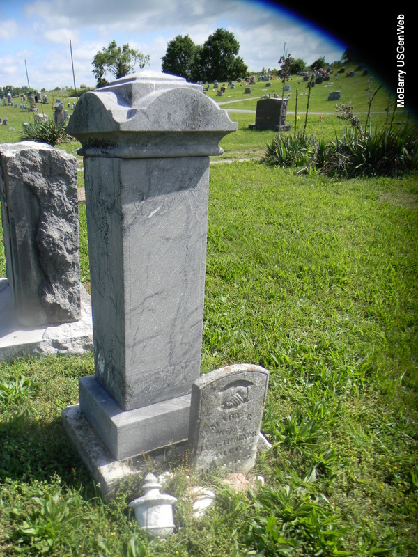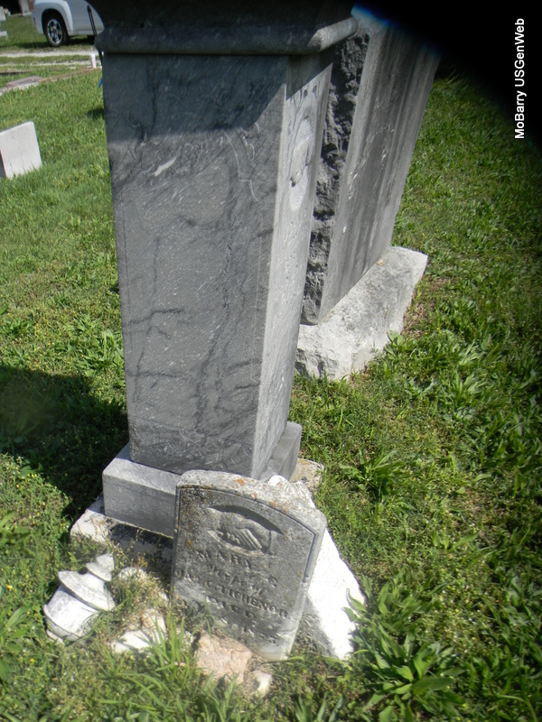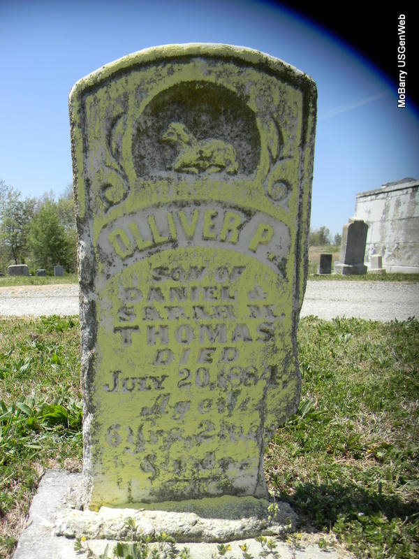 | THOMAS, Oliver Perry | Abt. 1878 | July 20, 1884 | Inscription: "Son of Daniel and Sarah M." "Aged 6 yrs. 2 mos." - Research Note: Son of Daniel Thomas and Sarah Matilda (Parker) McCallister. | Note Phyllis Long Photo Bill Utter |