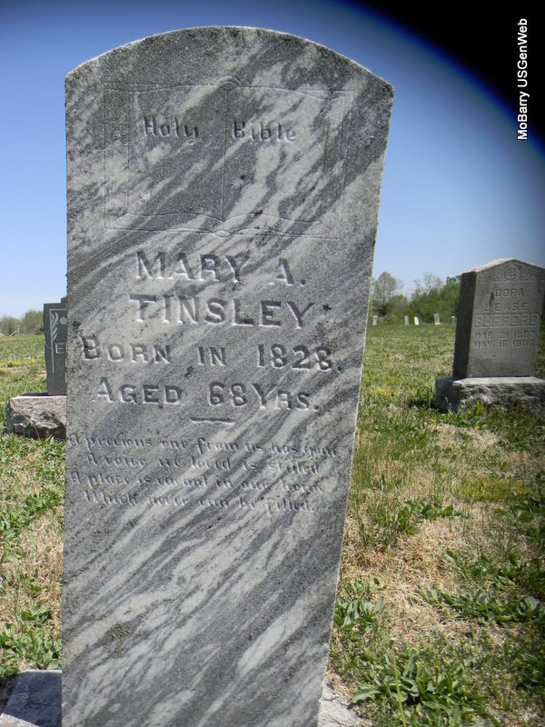 | TINSLEY, Mary A. | 1828 | Abt. 1896 | Research Note: - 1880 Census, Franklin, Newton, Missouri - Mary A. Tinsley, age 50, widowed, born VA; Ella Bimford, age 13, niece, born VA. | Census Phyllis Long Photo Bill Utter |