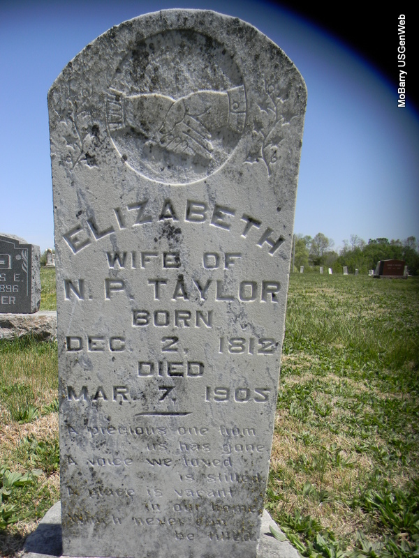 | TAYLOR, Elizabeth | Dec. 2, 1812 | Mar. 7, 1905 | Inscription: "Wife of N. P." - Research Note: She was living with her daughter, Mary Jane (Taylor) Bufford, in the 1900 Census, Newton Co., MO. Mary Jane is buried at Rocky Comfort Cemetery. | Census Phyllis Long Photo Bill Utter |