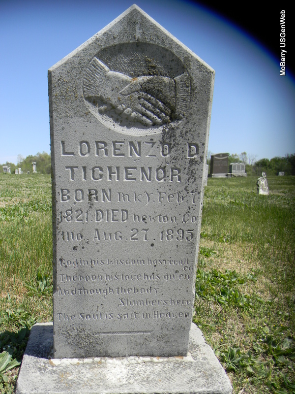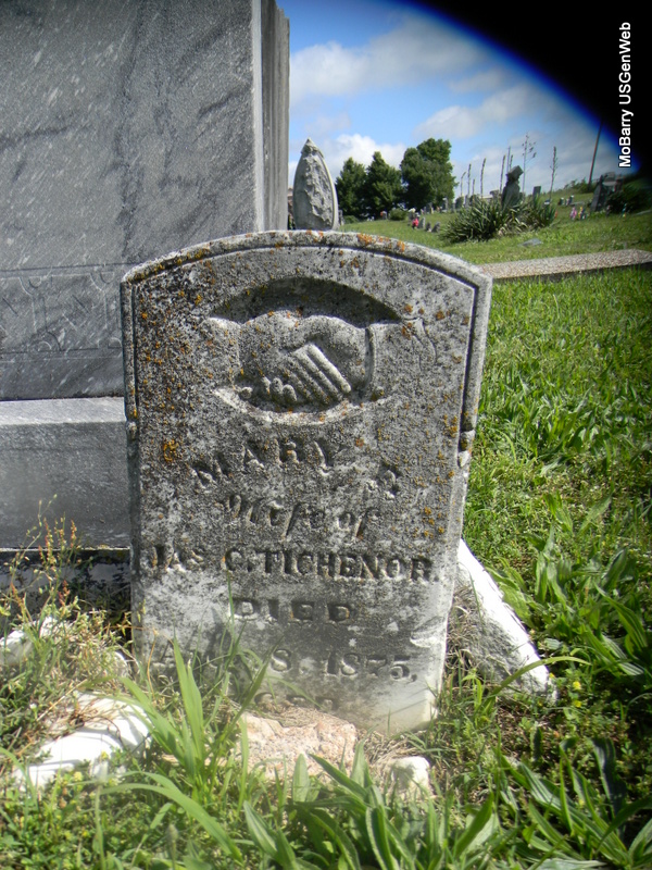 Inscription: "Wife of James C. Tichenor" "Aged 17 Yrs. 8 Ms. 21 D." - Research Note: Stone leaning against another tall monument stone. Daughter of John Patrick Montgomery and Lucinda Caroline Perry. James Clinton Tichenor married Mary Montgomery on July 9, 1874 in Newton Co., MO. - Another Photo - Another Photo - Another Photo | MO Marriage Records Census Phyllis Long Photos Bill Utter |