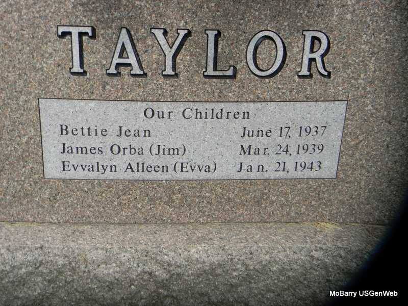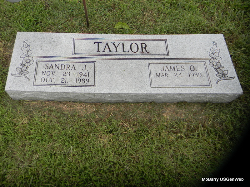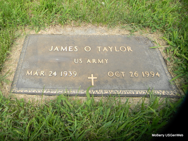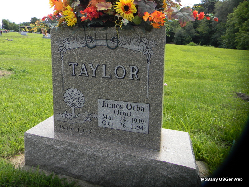| TAYLOR, James Orba | Mar. 24, 1939 | Oct. 26, 1994 | SSW: Sandra J. - Research Note: He has two stones. There is no death date on the stone shared with Sandra. Apparently not buried with her. There is a death date on the single stone. Son of Orba William Taylor and Wetona Dale Eastburn. James Orba Taylor, age 47, married Sandra Jane (Harvey) Taylor on June 14, 1986 in McDonald Co., MO. Witnessed by mothers, Wetona Taylor and Lorene Harvey. - Another Stone - Military Stone - Inscription: "US ARMY" | MO Marriage Records Photos Bill Utter |