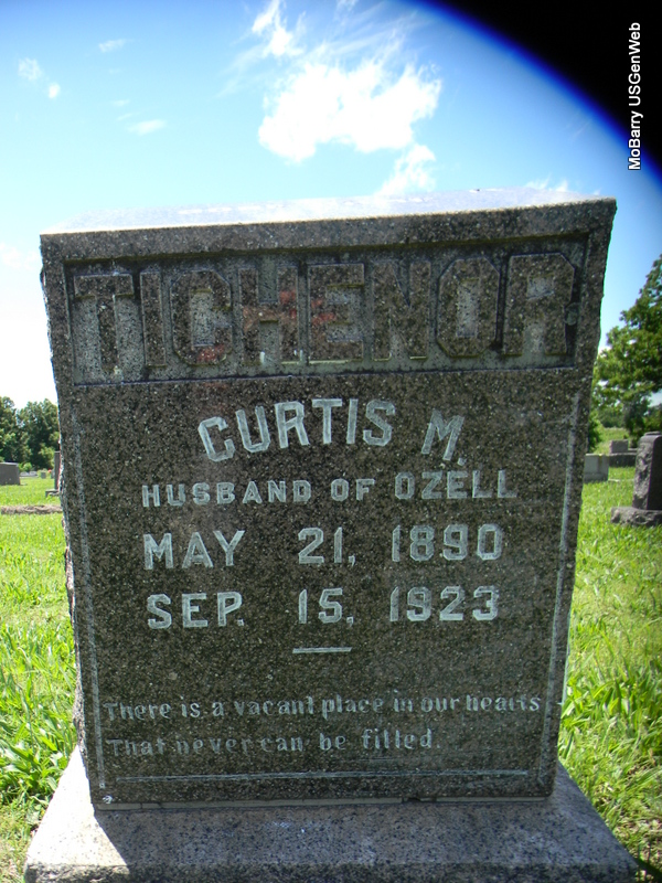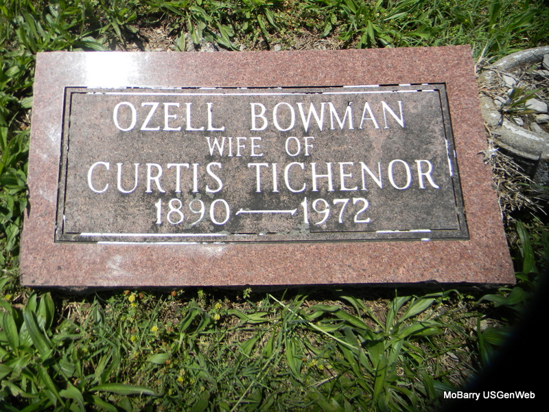 | TICHENOR, Ozell (BOWMAN) (REED) | 1890 | 1972 | Inscription: "Wife of Curtis" - Research Note: Daughter of Samuel Leonard Bowman and first wife Laura Bufford. Ozell Bowman married Curtis Tichenor on Feb. 24, 1911 in Newton Co., MO. Researchers say she second married Lee Reed. | MO Marriage Records Phyllis Long Photo Bill Utter |