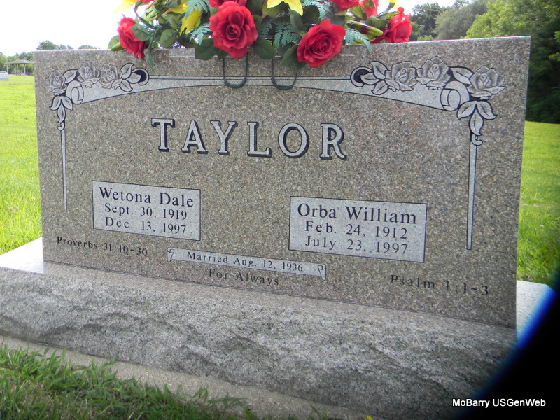 | TAYLOR, Orba William | Feb. 24, 1912 | July 23, 1997 | SSW: Wetona Dale - Inscription: "Married Aug. 12, 1936" - Research Note: Son of Robert Lee Taylor and Allie Lillian Jones. - Back of Stone | Census Phyllis Long Photos Bill Utter |