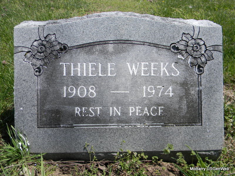 | WEEKS, Olin Thiele | Sept. 9, 1908 | June 1974 | Research Note: Son of Oscar C. Weeks and Emma Gardner. Thiele Weeks, age 42, of Purdy, MO, married Mona Jones, age 27, of Purdy, MO, on Mar. 24, 1952 in Benton Co., AR. Olin Thiele Weeks, age 49, married Wilma Solley, age 53, on July 17, 1958 in Granby, Newton Co., MO. | Census MO Marriage Records AR Marriage Index Phyllis Long Photo Bill Utter |