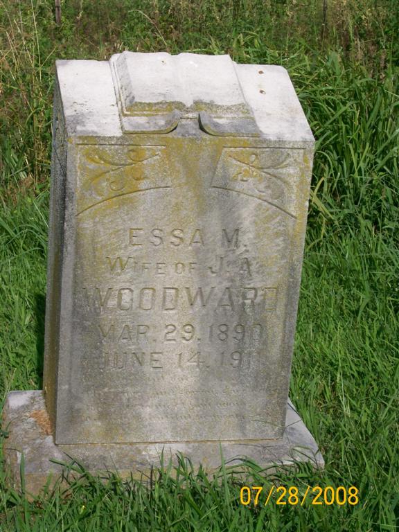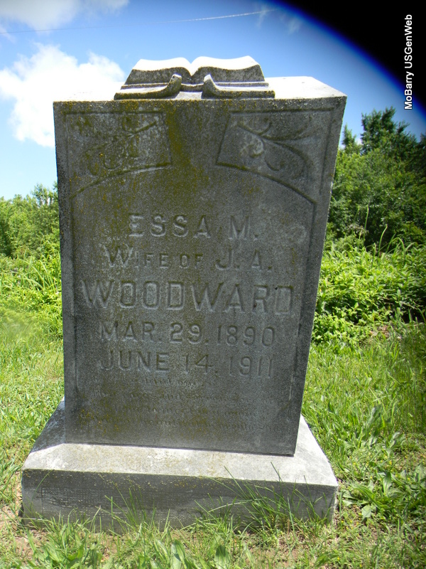 | WOODWARD, Essa M. (REED) | Mar. 29, 1890 | June 14, 1911 | Inscription: "Wife of James Andrew Woodward" - Research Note: First wife of James A. Woodward. Daughter of Robert Marion Reed and Martha A. McBride. - April 10, 1909, Saturday, Cassville Democrat - Marriage Licenses: James Woodward, Pierce City and Essa Reed, Exeter. - Another Photo | Online Newspapers Phyllis Long Photo Jay Trace Photo Bill Utter |