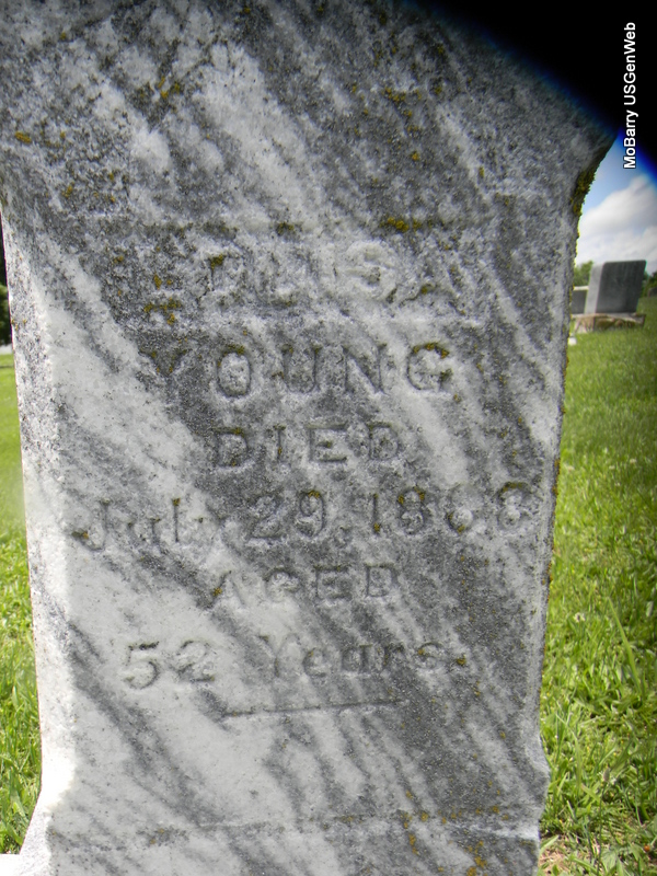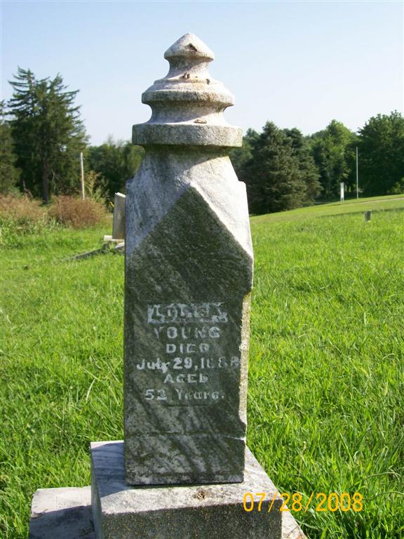 | YOUNG, Louisa | Abt. 1836 | July 29, 1888 | SSW: J. B. - Inscription: "Aged 52 years" - Another Photo | Photo Jay Trace Photo Bill Utter |