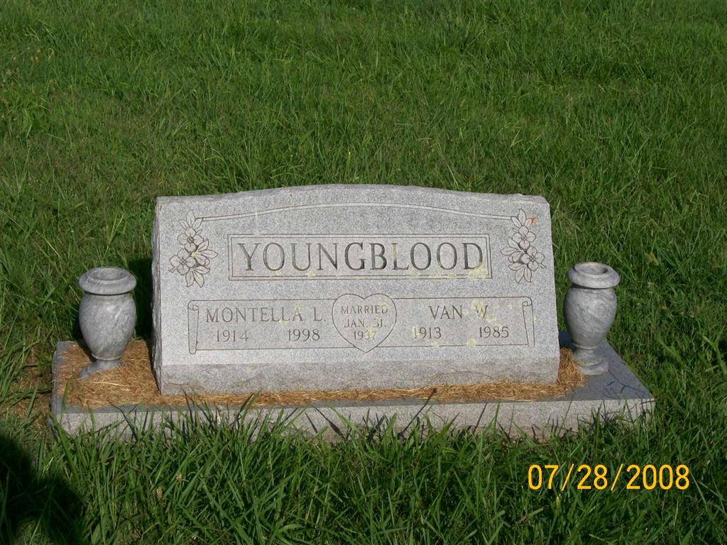 | YOUNGBLOOD, Van Walter | Jan. 28, 1913 | Oct. 21, 1985 | SSW: Montella L. - Inscription: "Married Jan. 31, 1937" - Research Note: Son of Walter Edward Youngblood and Mary Elizabeth Tarvin. Van Youngblood married Montella Duncan on Jan. 31, 1937 in Exeter, Barry Co., MO. - Another Photo | Census MO Marriage Records Photo Jay Trace Photo Bill Utter |