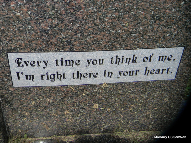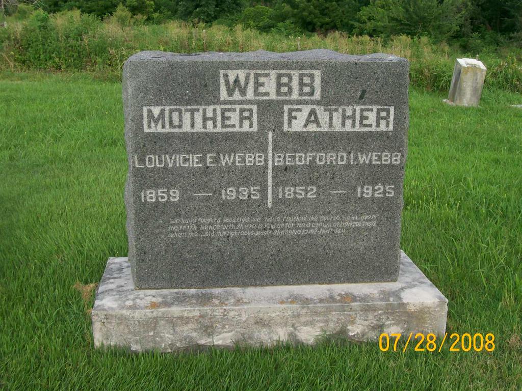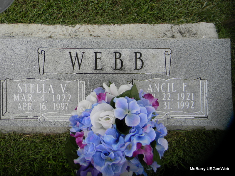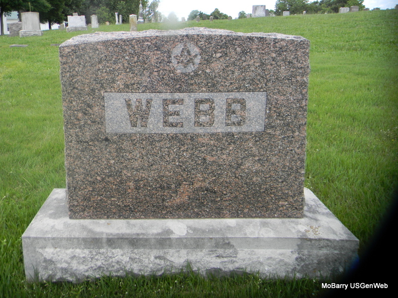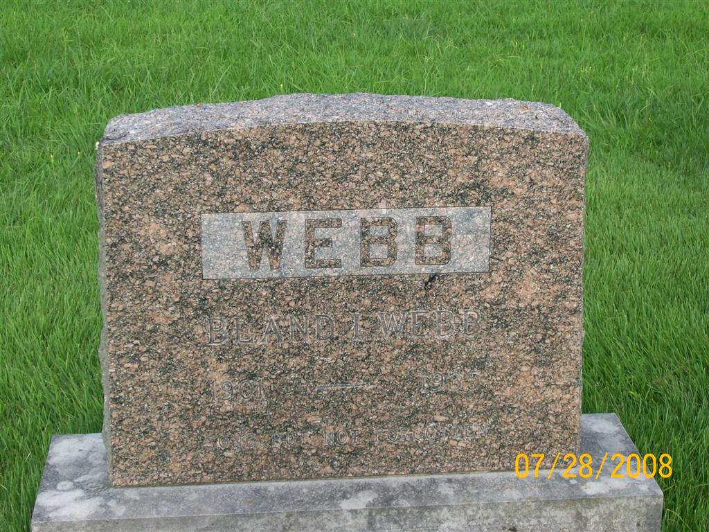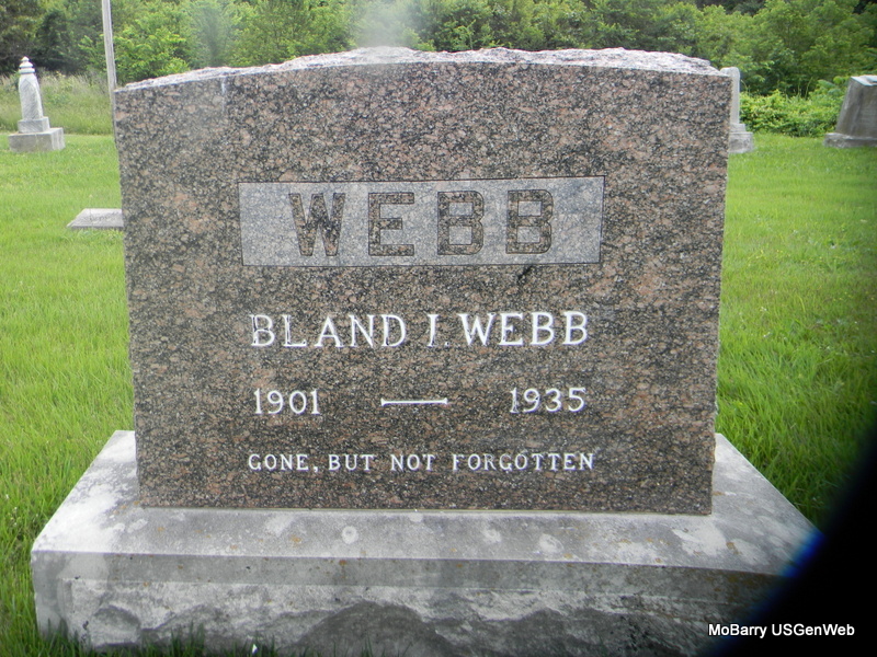 Inscription: "Gone But Not Forgotten" - Research Note: His death certificate names Bedford I. Webb, born AR, as his father and Louvicie Patterson, born AR, as his mother. Jessie (Grimmett) Webb was given as his wife's name and he was a farmer. - Bland Webb married Jessie Grimmett on June 8, 1935 in Exeter, Barry Co., MO. - Another Photo - Back of Stone | Death Certificate Donna Cooper MO Marriage Records Phyllis Long Photo Jay Trace Photos Bill Utter |