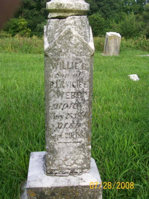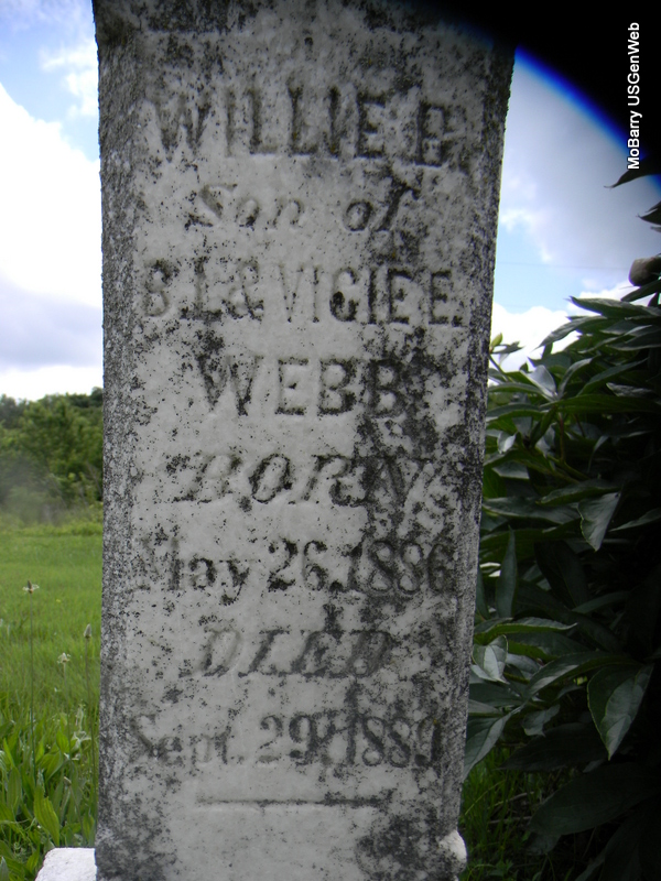 | WEBB, Willie B. | May 26, 1886 | Sept. 29, 1889 | Inscription: "Son of B. I. and Vicie E. Webb" - Research Note: Son of Bedford Isaiah Webb and Louvicie Patterson. - Another Photo - Another Photo | Note Phyllis Long Photo Jay Trace Photos Bill Utter |