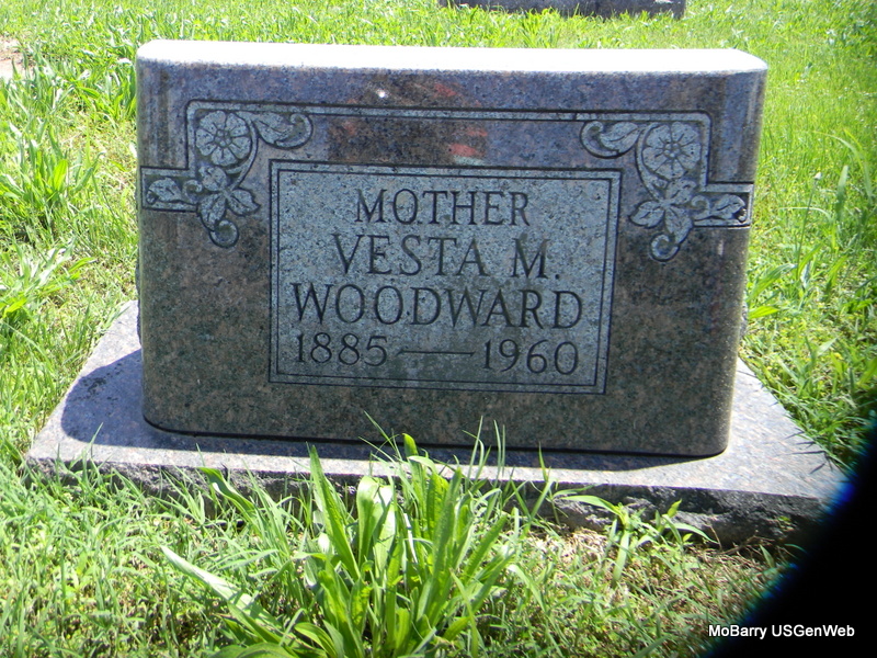 Inscription: "Mother" - Research Note: Daughter of Elias Bradford Lamberson and Victoria C. Davidson. Second wife of James Andrew Woodward. James A. Woodward married Vesta M. Lamberson on Sept. 6, 1918 in Rocky Comfort, McDonald Co., MO. - Wheaton, Mo. - Services for Mrs. Vesta Woodward, 74 years old, former resident of Wheaton and Rocky Comfort, Mo., who died Monday night in a Reno Nev. hospital, will be at 2 o'clock Saturday afternoon in Prosperity Baptist church in Rocky Comfort. The Rev. Coy Holmes will officiate. Burial will be in Rocky Comfort cemetery under direction of McQueen funeral home of Wheaton. Born near Rocky Comfort in McDonald county, Mrs. Woodward was the daughter of the late E. B. and Victoria Lamberson. She lived all her life in this community until moving to Elko Nev., in 1952. She was a member of the Prosperity Baptist church. Surviving are a daughter, Mrs. Willa Fern Elbert of Elko; a stepson, Otho Woodward of Fresno Calif.; and a sister, Mrs. Hettie Goostree of Rocky Comfort. | Census MO Marriage Records Joplin Globe Phyllis Long Headstone Cheryl |