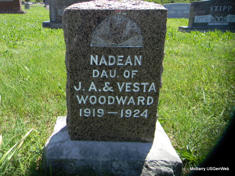 Inscription: "Dau. of J. A. and Vesta" - Research Note: Wheaton Journal, May 9, 1920 - Little Edna Nadine Woodward, daughter of James and Vesta Woodward was born near Rocky Comfort, Mo., October 18, 1919. Died April 20, 1924, age 4 years, 6 months and 2 days. She leaves a father and mother, one baby sister and a half brother, besides a host of other relatives and friends to mourn her departure. Nadine was sick only a few days of appendicitis. She was taken to the hospital at Stella for an operation Saturday, April 19, living only a few short hours after the operation was performed. Funeral services were held at the Baptist church in Rocky Comfort by Pastor C. M. Smith. | Online Obit Phyllis Long Photo Bill Utter |
