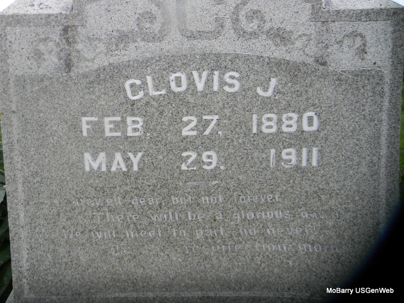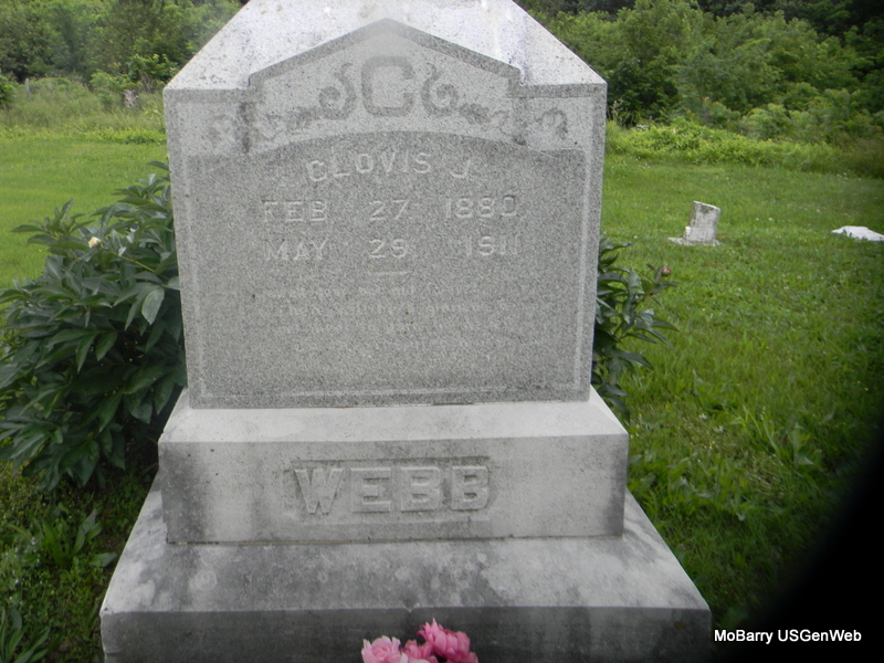 | WEBB, Clovis Jarman | Feb. 27, 1880 | May 25, 1911 | Research Note: Son of Bedford Isaiah "Dink" Webb and Louvicie E Patterson. His wife was Orizaba "Zaba" Cantrell. She is buried at Dice Cemetery, Fairview, Newton Co., MO. She died in 1957. Clovis Webb married Zabe Cantrell on Feb. 27, in Cassville, Barry Co., MO. - March 2, 1907, Saturday, Cassville Democrat - Marriage Licenses: Clovis Webb and Zohe Cantrell of Rocky Comfort. - Rogers Democrat, June 8, 1911 - WEBB, Clovis - Miss Onia Patterson and her brother were called to Rocky Comfort a few days ago about the illness of their nephew, Clovis Webb. We have since learned of his death. He had been sick for a long time. - Another Photo - Another Photo | Online Newspapers Rogers Democrat MO Marriage Records Phyllis Long Photo Jay Trace Photos Bill Utter |